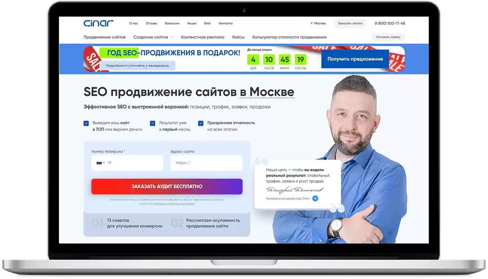Раскрутка сайтов включает в себя работу специалистов нескольких направлений. Привлекаются маркетологи, дизайнеры, копирайтеры. Прорабатывается каждая составляющая часть сайта клиента для того, чтобы повысить его позицию в поисковых системах. Именно грамотный подход к раскрутке портала способен привести компанию к успеху в той или иной отрасли. Благодаря постоянному росту клиентов в агентстве “CINAR”, мы продвигаем сайты недорого.